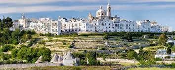 OSTUNI, la Città Bianca, cattura l'occhio con il suo caratteristico colore che permette di distinguerla da lontano, adagiata sui dolci declivi delle Murge orientali. Affascina con i suoi vicoli e il panorama sulla piana degli ulivi millenari che si spinge fino al mare . I colori che si alternano lungo la strada per raggiungerla, tra il rosso della terra, il verde degli ulivi e l'azzurro del cielo, creano un forte impatto nel contrasto con il bianco candido delle vie labirintiche della città.(15 km)